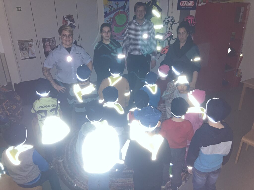 Im Einsatz waren Materialien, die im Dunkeln leuchten und somit im Straßenverkehr sehr gut sichtbar machen (z.B. reflektierende Armbänder, Blinkis für den Rucksack, Aufkleber für den Tornister, Sicherheitskragen…)